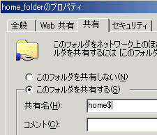- [このフォルダを共有する]にチェックを入れ、共有名として、[home$]とする。