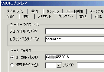 『ユーザー環境プロファイル』のホームディレクトリのパスで[\\(コンピュータ名)\51001$]と指定する。