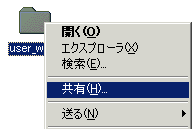 - 作成したフォルダを右クリックし、[共有とセキュリティ]を選択し、ダイアログを出す。