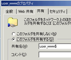 - [このフォルダを共有する]にチェックを入れ、共有名として、[user_www$]とする。