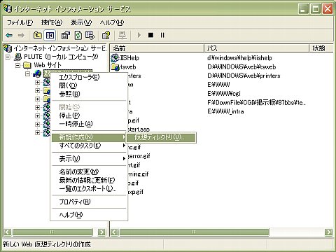 - [既定のWebサイト]を右クリックし、[新規作成]→[仮想ディレクトリ]を選択し、作成ウィザードを起動する。