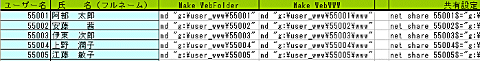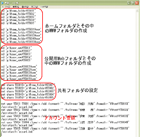 これを手作業で行うのは非常に非効率です。そこで、効率的にアカウント登録作業をするために、エクセルや専用ソフトを利用するというわけです。しかし、サーバー機には、エクセルなどアプリケーションをインストールしていないことも多いので、あらかじめ他のコンピュータで名簿を作成後、バッチファイルを作り、ネットワーク経由で転送したり、FD・CD-ROMなどのメディアでサーバー機に持ってくることが必要になってきます。