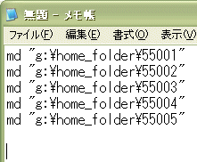 ※バッチファイル中のサーバー機へのコマンドで、フォルダの共有設定のみサーバー機でしか実行することができません。それ以外については、クライアント機からでも実行は可能ですが、上記で作成したバッチファイルをそのまま利用することは不可能で、パス名の変更が必ず必要です。その場合は、UNC 指定(例えば、[\\local_host\])か、ネットワークドライブの接続をしてそのドライブ名を使ってパスを指定する必要があります。