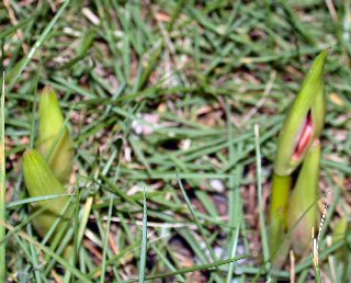 2003/09/25 花茎が発芽しました。右側の花茎を良く見ると、赤い花被が見えています。 |